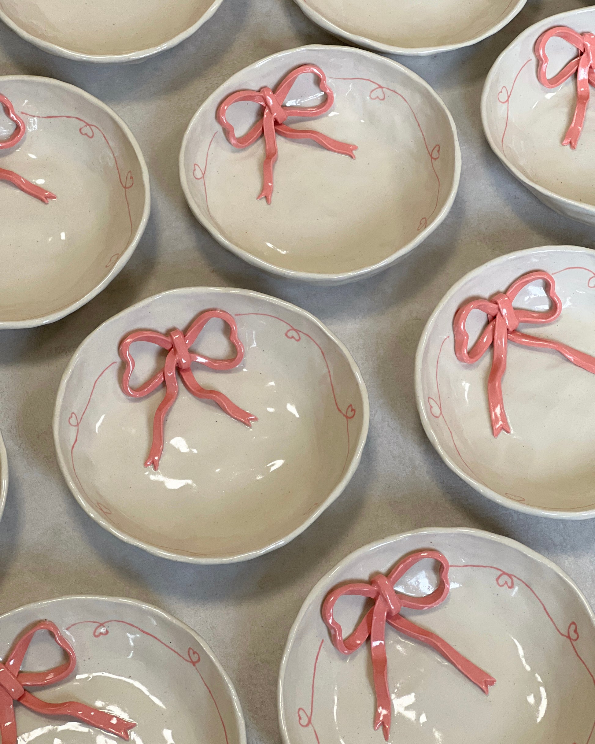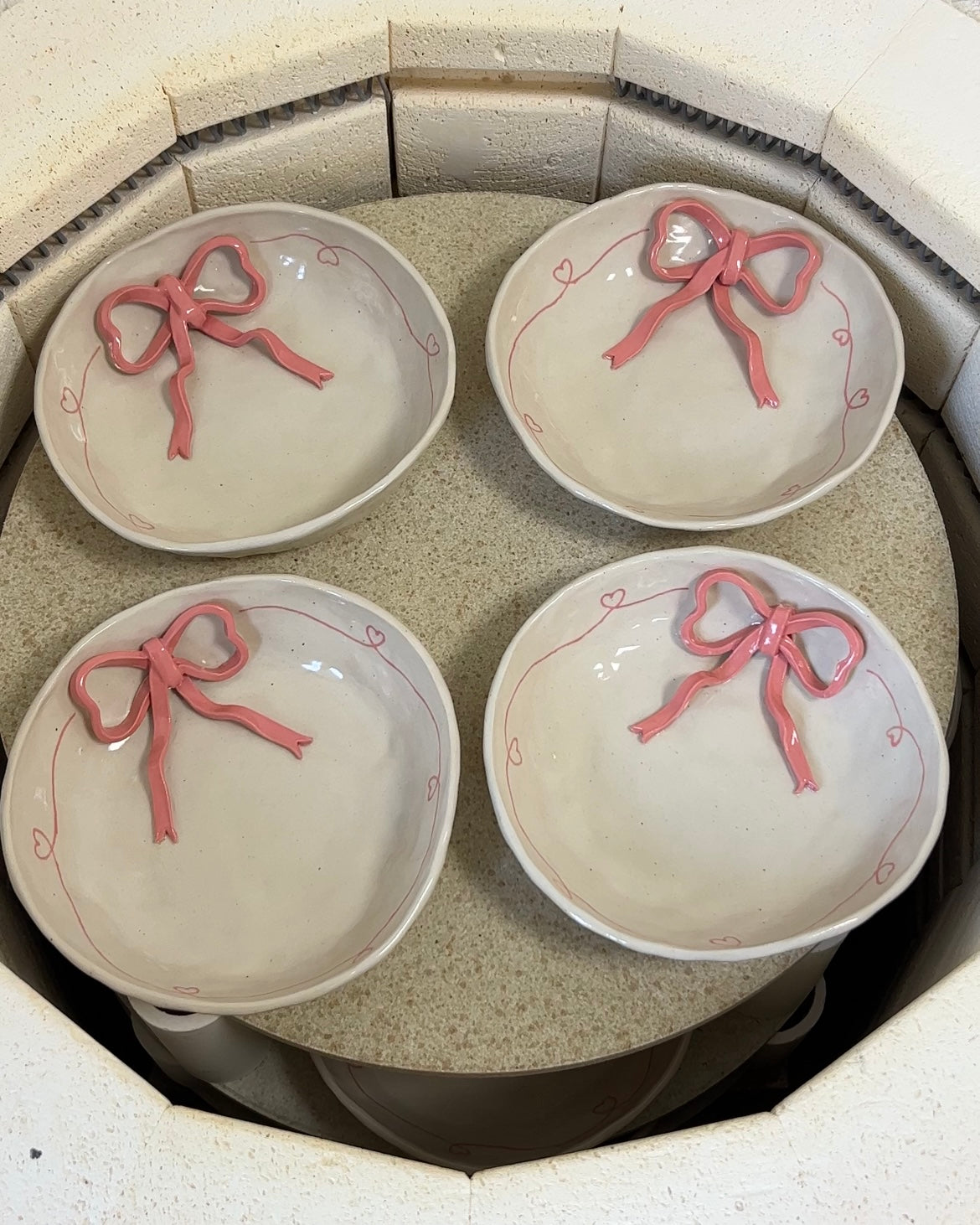 your favorite plate but with a valentine's day twist. ''bows in love'' jewelry dish, decorated with a heart ribbon pattern and heart shaped bow 🎀