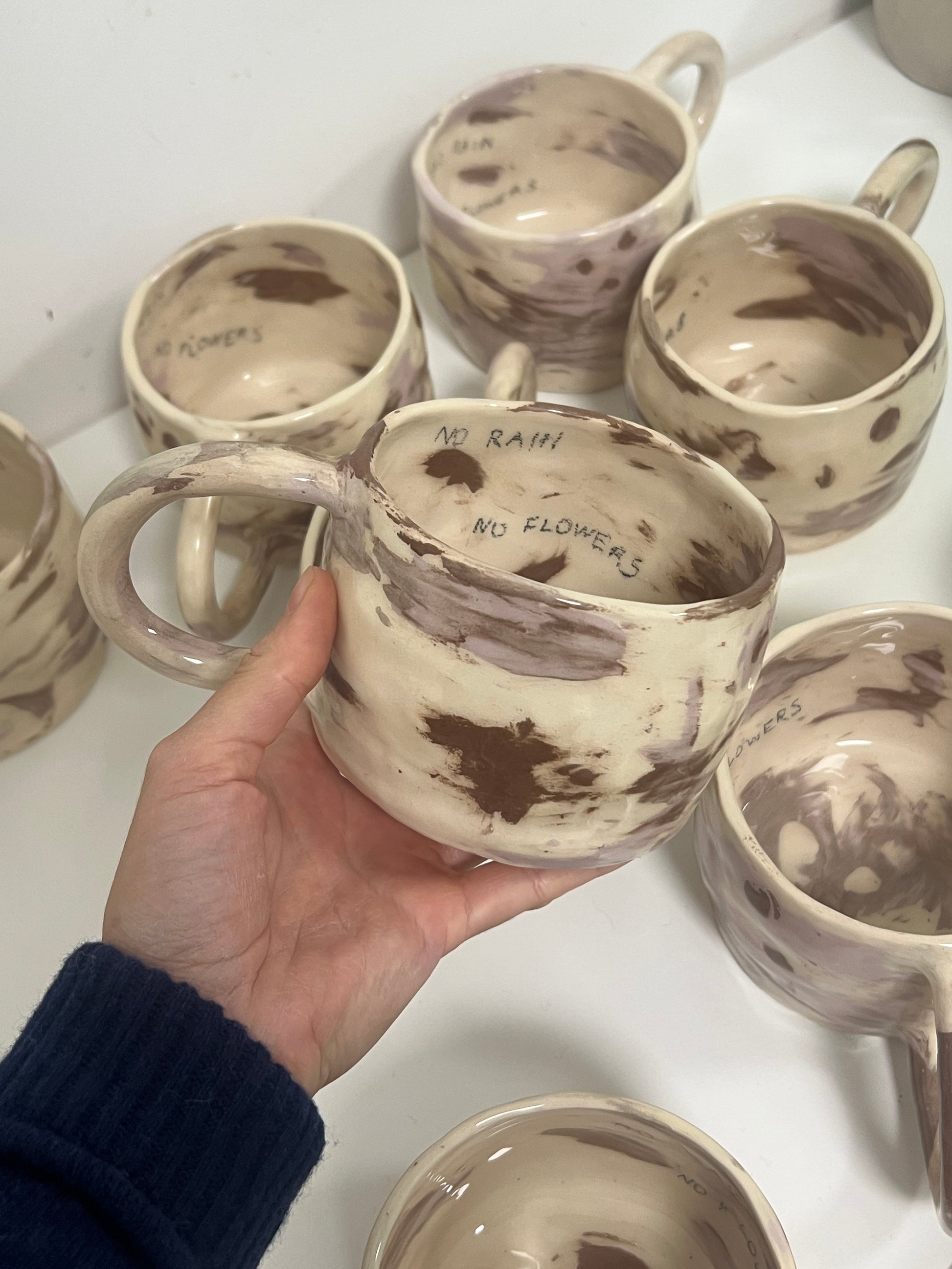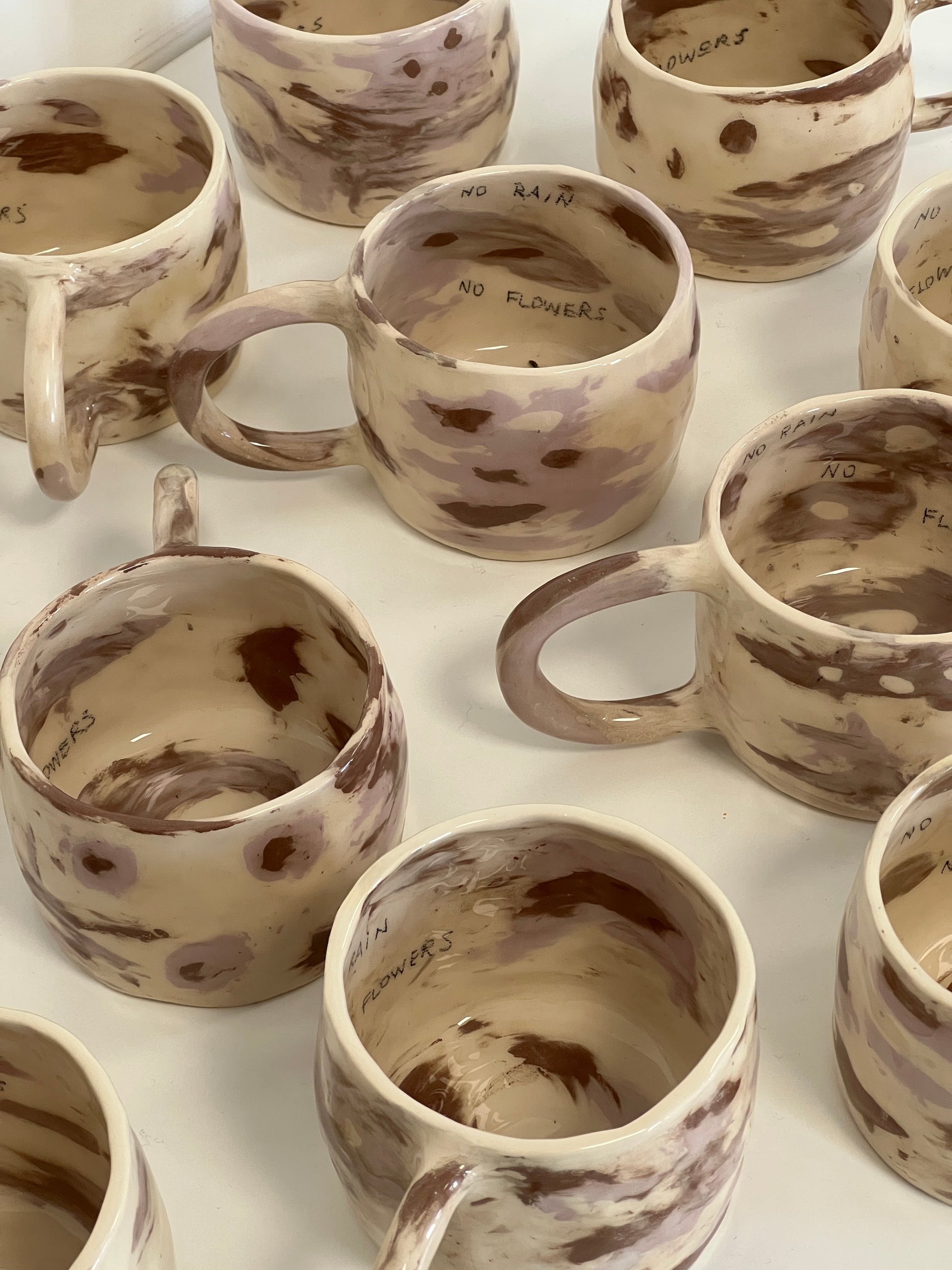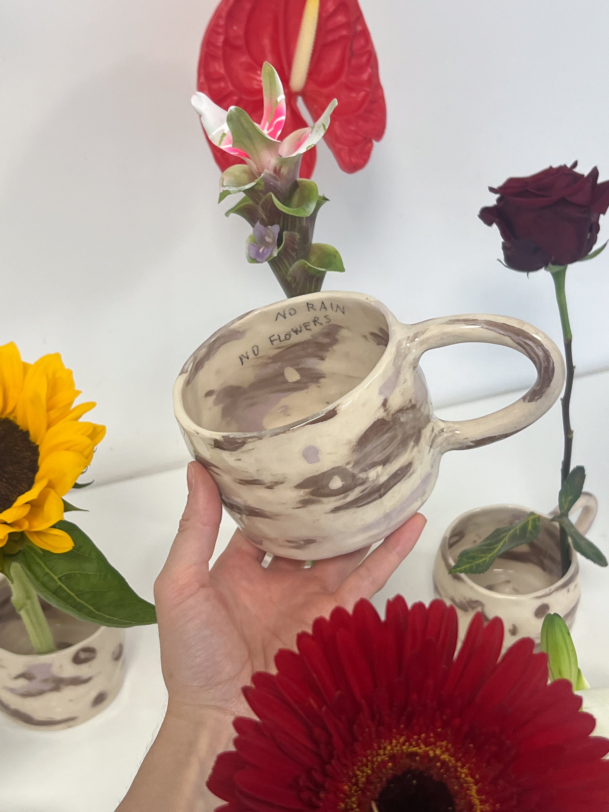 lilac and brown marble mugs. pencil phrase inside “no rain no flowers”.