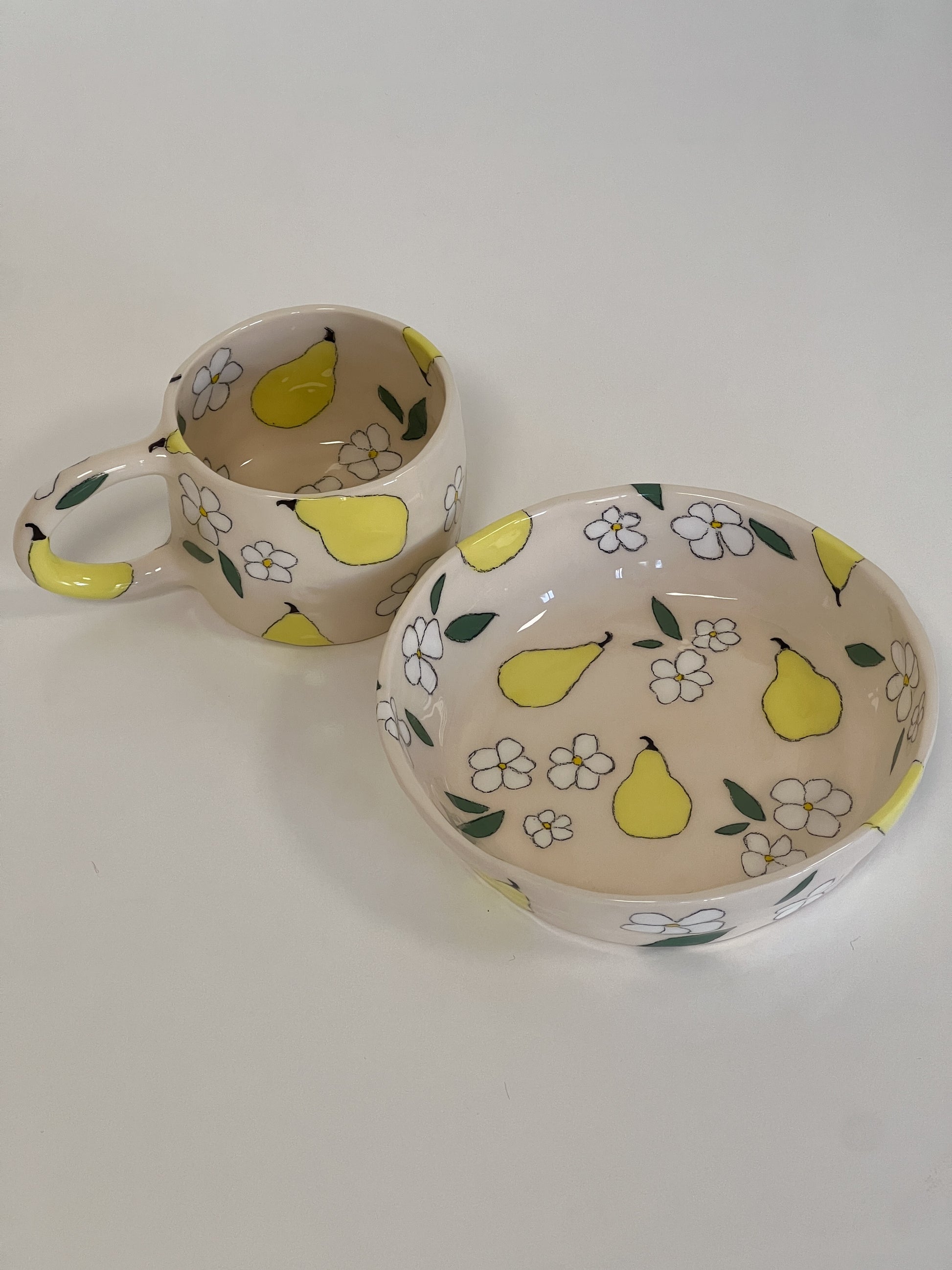 the pear blossom set includes a matching mug and bowl.